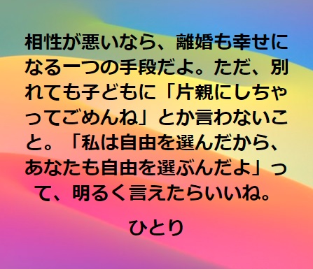 相性が悪いなら、離婚も幸せになる一つの手段だよ。ただ、別れても子どもに「片親にしちゃってごめんね」とか言わないこと。「私は自由を選んだから、あなたも自由を選ぶんだよ」って、明るく言えたらいいね。