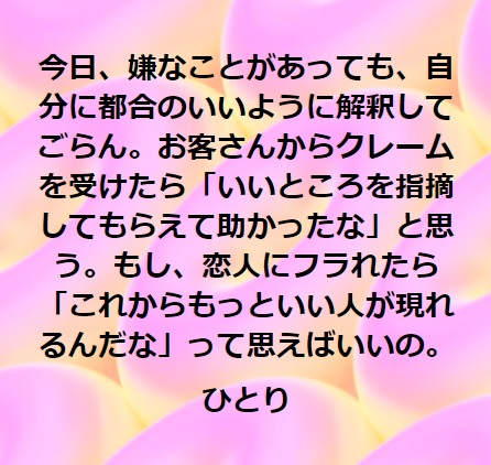 今日、嫌なことがあっても、自分に都合のいいように解釈してごらん。お客さんからクレームを受けたら「いいところを指摘してもらえて助かったな」と思う。もし、恋人にフラれたら「これからもっといい人が現れるんだな」って思えばいいの。