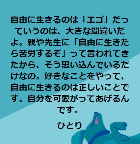 自由に生きるのは「エゴ」だっていうのは、大きな間違いだよ。親や先生に「自由に生きたら苦労するぞ」って言われてきたから、そう思い込んでいるだけなの。好きなことをやって、自由に生きるのは正しいことです。自分を可愛がってあげるんです。
