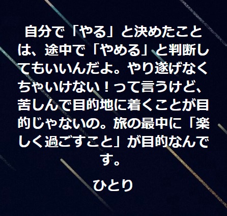 自分で「やる」と決めたことは、途中で「やめる」と判断してもいいんだよ。やり遂げなくちゃいけない!って言うけど、苦しんで目的地に着くことが目的じゃないの。旅の最中に「楽しく過ごすこと」が目的なんです。