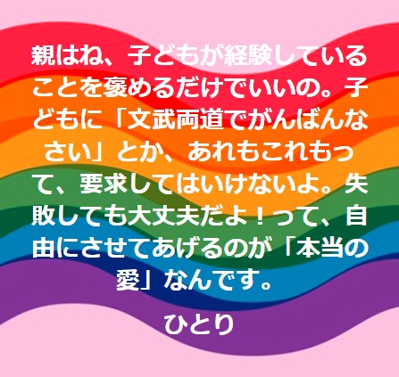 親はね、子どもが経験していることを褒めるだけでいいの。子どもに「文武両道でがんばんなさい」とか、あれもこれもって、要求してはいけないよ。失敗しても大丈夫だよ!って、自由にさせてあげるのが「本当の愛」なんです。