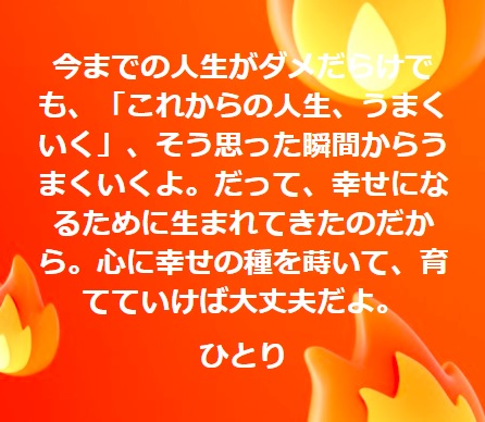 今までの人生がダメだらけでも、「これからの人生、うまくいく」、そう思った瞬間からうまくいくよ。だって、幸せになるために生まれてきたのだから。心に幸せの種を蒔いて、育てていけば大丈夫だよ。