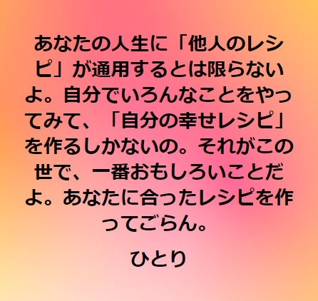あなたの人生に「他人のレシピ」が通用するとは限らないよ。自分でいろんなことをやってみて、「自分の幸せレシピ」を作るしかないの。それがこの世で、一番おもしろいことだよ。あなたに合ったレシピを作ってごらん。