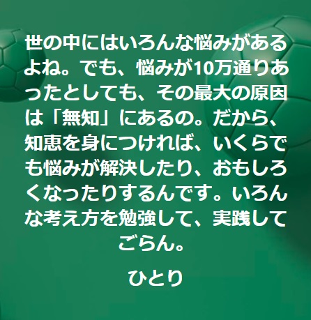 世の中にはいろんな悩みがあるよね。でも、悩みが10万通りあったとしても、その最大の原因は「無知」にあるの。だから、知恵を身につければ、いくらでも悩みが解決したり、おもしろくなったりするんです。いろんな考え方を勉強して、実践してごらん。
