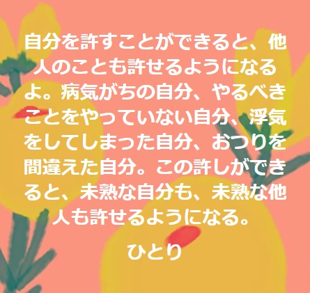 自分を許すことができると、他人のことも許せるようになるよ。病気がちの自分、やるべきことをやっていない自分、浮気をしてしまった自分、おつりを間違えた自分。この許しができると、未熟な自分も、未熟な他人も許せるようになる。