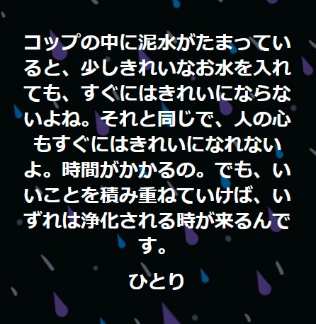 コップの中に泥水がたまっていると、少しきれいなお水を入れても、すぐにはきれいにならないよね。それと同じで、人の心もすぐにはきれいになれないよ。時間がかかるの。でも、いいことを積み重ねていけば、いずれは浄化される時が来るんです。