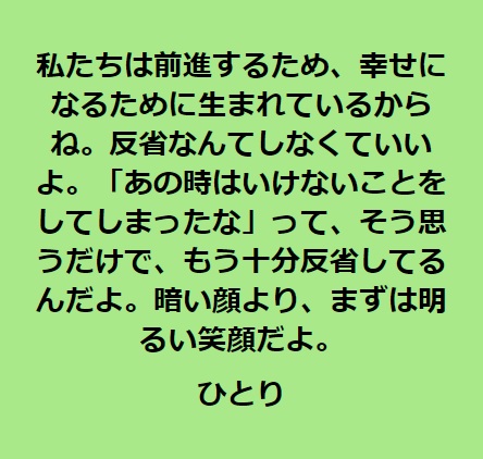 私たちは前進するため、幸せになるために生まれているからね。反省なんてしなくていいよ。「あの時はいけないことをしてしまったな」って、そう思うだけで、もう十分反省してるんだよ。暗い顔より、まずは明るい笑顔だよ。
