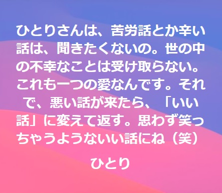 ひとりさんは、苦労話とか辛い話は、聞きたくないの。世の中の不幸なことは受け取らない。これも一つの愛なんです。それで、悪い話が来たら、「いい話」に変えて返す。思わず笑っちゃうようないい話にね(笑)