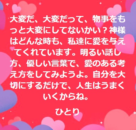 大変だ、大変だって、物事をもっと大変にしてないかい?神様はどんな時も、私達に愛を与えてくれています。明るい話し方、優しい言葉で、愛のある考え方をしてみようよ。自分を大切にするだけで、人生はうまくいくからね。