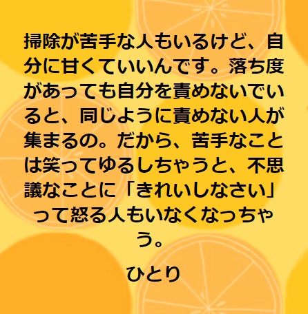 掃除が苦手な人もいるけど、自分に甘くていいんです。落ち度があっても自分を責めないでいると、同じように責めない人が集まるの。だから、苦手なことは笑ってゆるしちゃうと、不思議なことに「きれいしなさい」って怒る人もいなくなっちゃう。