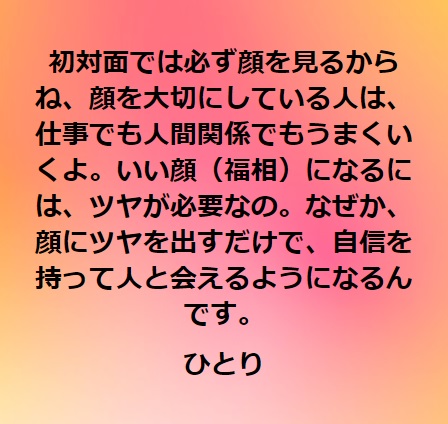 初対面では必ず顔を見るからね、顔を大切にしている人は、仕事でも人間関係でもうまくいくよ。いい顔(福相)になるには、ツヤが必要なの。なぜか、顔にツヤを出すだけで、自信を持って人と会えるようになるんです。