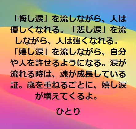 「悔し涙」を流しながら、人は優しくなれる。「悲し涙」を流しながら、人は強くなれる。「嬉し涙」を流しながら、自分や人を許せるようになる。涙が流れる時は、魂が成長している証。歳を重ねるごとに、嬉し涙が増えてくるよ。