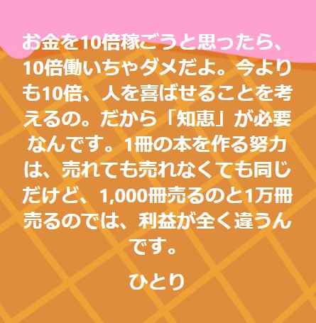 お金を10倍稼ごうと思ったら、10倍働いちゃダメだよ。今よりも10倍、人を喜ばせることを考えるの。だから「知恵」が必要なんです。1冊の本を作る努力は、売れても売れなくても同じだけど、1,000冊売るのと1万冊売るのでは、利益が全く違うんです。