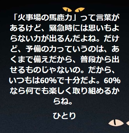 「火事場の馬鹿力」って言葉があるけど、緊急時には思いもよらない力が出るんだよね。だけど、予備の力っていうのは、あくまで備えだから、普段から出せるものじゃないの。だから、いつもは60%で十分だよ。60%なら何でも楽しく取り組めるからね。