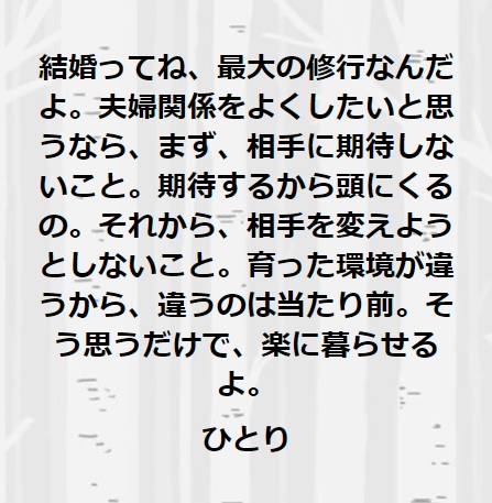 結婚ってね、最大の修行なんだよ。夫婦関係をよくしたいと思うなら、まず、相手に期待しないこと。期待するから頭にくるの。それから、相手を変えようとしないこと。育った環境が違うから、違うのは当たり前。そう思うだけで、楽に暮らせるよ。