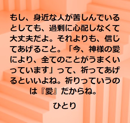 もし、身近な人が苦しんでいるとしても、過剰に心配しなくて大丈夫だよ。それよりも、信じてあげること。「今、神様の愛により、全てのことがうまくいっています」って、祈ってあげるといいよね。祈りっていうのは『愛』だからね。
