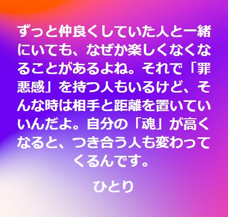 ずっと仲良くしていた人と一緒にいても、なぜか楽しくなくなることがあるよね。それで「罪悪感」を持つ人もいるけど、そんな時は相手と距離を置いていいんだよ。自分の「魂」が高くなると、つき合う人も変わってくるんです。