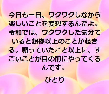 今日も一日、ワクワクしながら楽しいことを妄想するんだよ。令和では、ワクワクした気分でいると想像以上のことが起きる。願っていたこと以上に、すごいことが目の前にやってくるんです。
