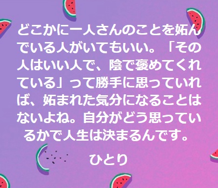 どこかに一人さんのことを妬んでいる人がいてもいい。「その人はいい人で、陰で褒めてくれている」って勝手に思っていれば、妬まれた気分になることはないよね。自分がどう思っているかで人生は決まるんです。