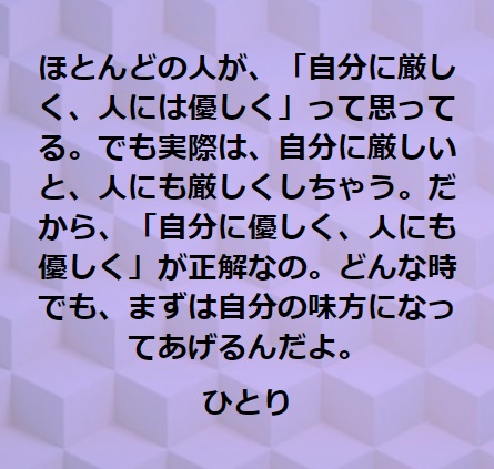 ほとんどの人が、「自分に厳しく、人には優しく」って思ってる。でも実際は、自分に厳しいと、人にも厳しくしちゃう。だから、「自分に優しく、人にも優しく」が正解なの。どんな時でも、まずは自分の味方になってあげるんだよ。
