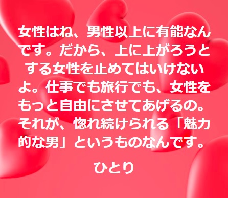 女性はね、男性以上に有能なんです。だから、上に上がろうとする女性を止めてはいけないよ。仕事でも旅行でも、女性をもっと自由にさせてあげるの。それが、惚れ続けられる「魅力的な男」というものなんです。