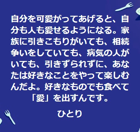自分を可愛がってあげると、自分も人も愛せるようになる。家族に引きこもりがいても、相続争いをしていても、病気の人がいても、引きずられずに、あなたは好きなことをやって楽しむんだよ。好きなものでも食べて「愛」を出すんです。