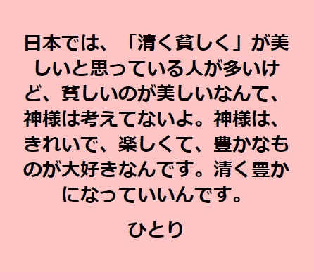 日本では、「清く貧しく」が美しいと思っている人が多いけど、貧しいのが美しいなんて、神様は考えてないよ。神様は、きれいで、楽しくて、豊かなものが大好きなんです。清く豊かになっていいんです。
