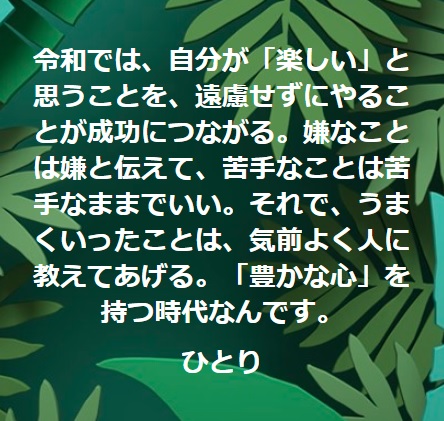令和では、自分が「楽しい」と思うことを、遠慮せずにやることが成功につながる。嫌なことは嫌と伝えて、苦手なことは苦手なままでいい。それで、うまくいったことは、気前よく人に教えてあげる。「豊かな心」を持つ時代なんです。