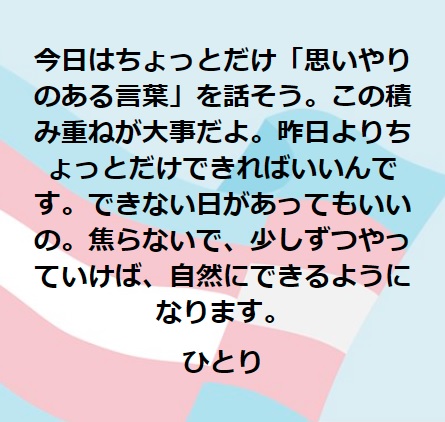 今日はちょっとだけ「思いやりのある言葉」を話そう。この積み重ねが大事だよ。昨日よりちょっとだけできればいいんです。できない日があってもいいの。焦らないで、少しずつやっていけば、自然にできるようになります。